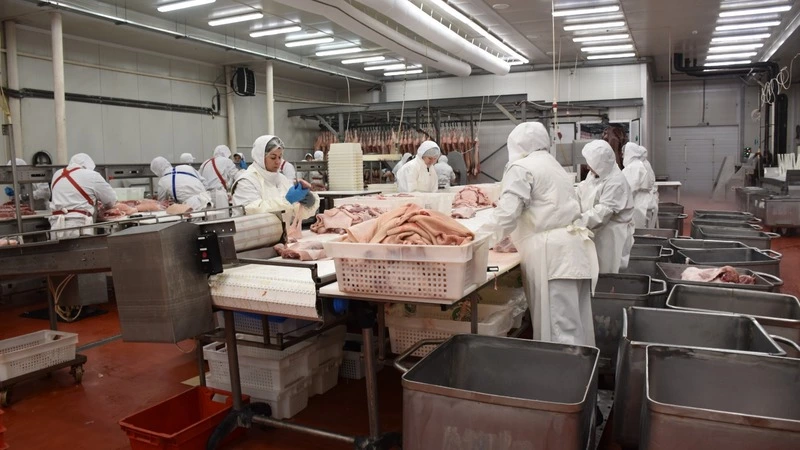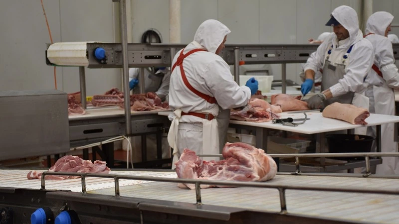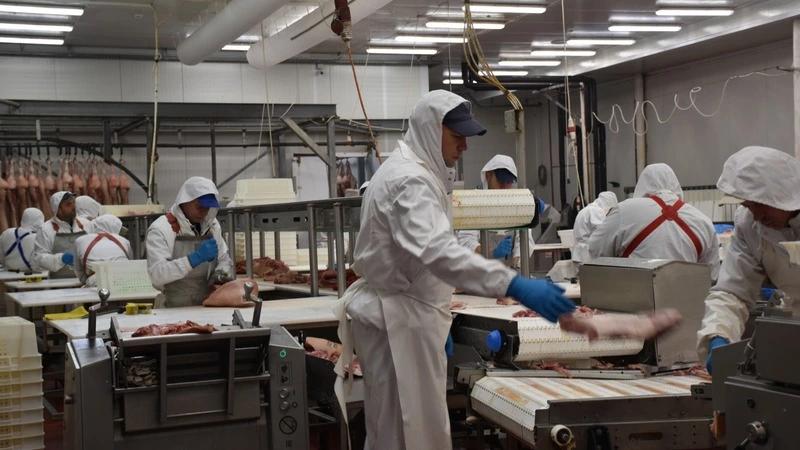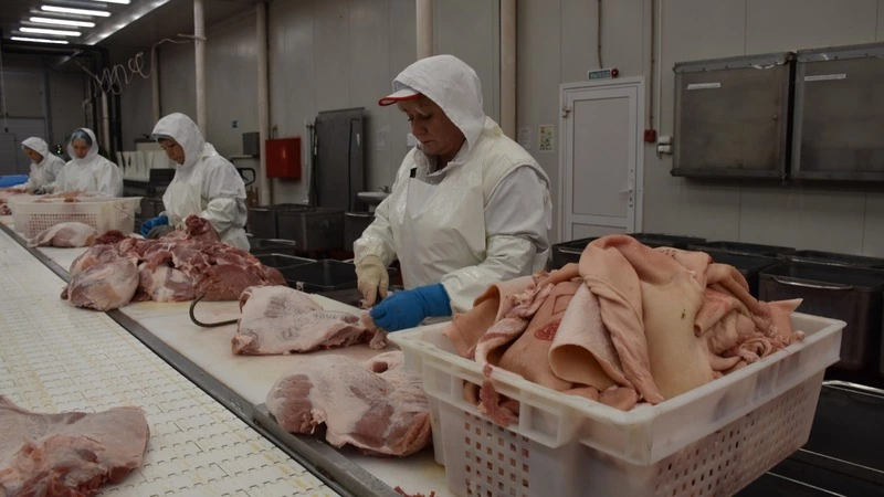 Сегодня на линии – мясо свинины. Поступившее после забоя сырьё уже охладили в камерах. Его подают на большой конвейер.