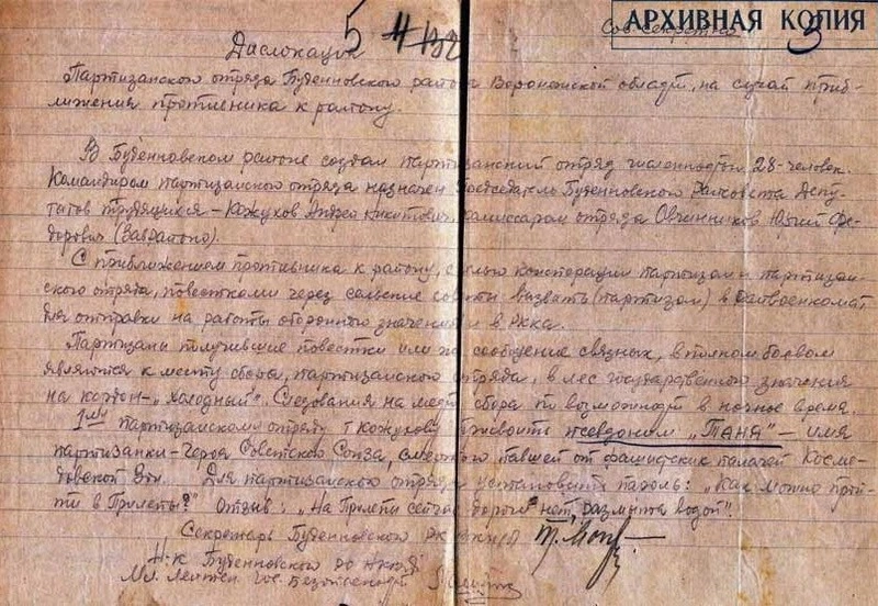 Из архивной копии протокола допроса от 11 февраля 1943 года командира отряда «Таня» Кожухова Андрея Никитовича, 1903 года рождения, уроженца села Прилепы Будённовского района Воронежской области, узнаём, что отряд существовал с 4 июля 1942 года до января 1943 года.