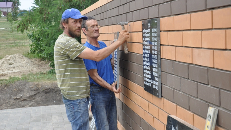 Работы по реконструкции братской могилы выполняет ООО «Комплектация» (руководитель Владимир Рубанов). За прошедшие две недели высококлассные каменщики Александр Пономарёв и Василий Коломейцев возвели стелу из разноцветного кирпича в виде георгиевской ленточки. К слову, выпуск продукции произведён в нашем районе, на кирпичном заводе «Красная гвардия».