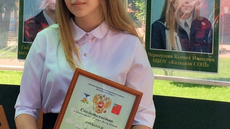 Ксения Черноусова – тоже из Казацкого. Принимает участие в самодеятельности местного Центра культурного развития. Успешно освоила дополнительную программу по направлению добровольчества в рамках зональной школы волонтёрских и общеобразовательных организаций «Ты решаешь!». Ксения – лауреат районной детской Доски почёта, член Совета актива и экскурсовод историко-краеведческого музея школы.