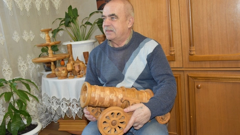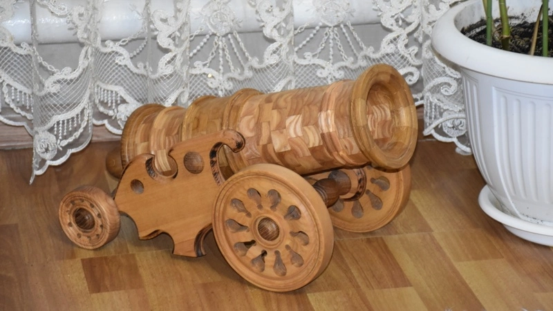По признанию мастера, самым трудоёмким изделием для него стала деревянная пушка, которая сегодня занимает центральное место в его доме. На её изготовление он потратил больше всего времени. А вот, к примеру, вазы выходят из рук столяра в среднем за неделю, но опять же, всё зависит от вдохновения, учитывая, что делается этот элемент домашнего интерьера из мелких деревянных квадратиков! Помимо, так скажем, грубых столярных работ по приданию отрезку дерева нужной формы, есть ещё и ювелирное действо по его подгонке, шлифовке.