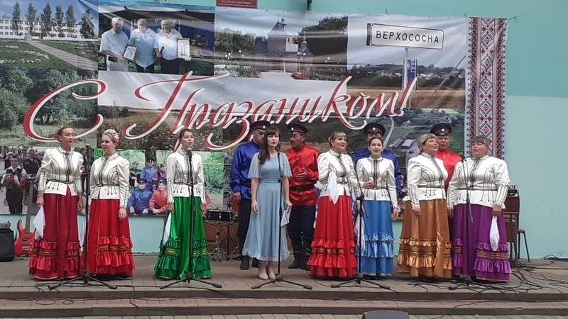 Начинается праздничное представление «Цвети село моё родное!». Импровизированная сцена, расположившаяся на ступеньках местного ЦКР, празднично украшена. Звучит песня о России, а ведущие – студенты Дария Придатченко и Артём Малиновский, стихами славят Родину, дают исторические сведения о возникновении Верхососны.
