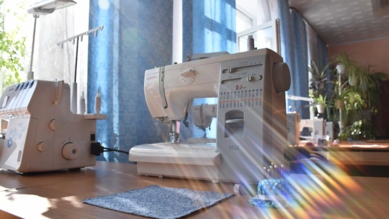 «Это оверлок. Он предназначен для отделки краёв ткани. Включаем, кладём край ткани, опускаем лапку и чуть нажимаем на педаль. Машинка начинает работу. Закончив, поднимаем лапку, убираем ткань, обрезаем лишнее – и готово», – прокомментировала свои действия девушка.