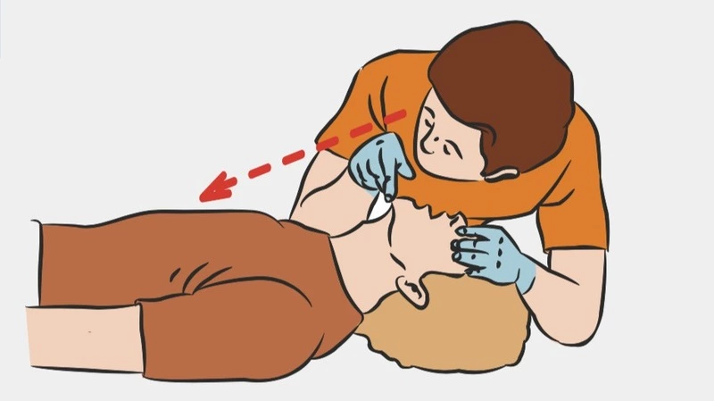 При отсутствии признаков сознания следует определить наличие дыхания у пострадавшего. Для этого необходимо восстановить проходимость дыхательных путей: одну руку положить ему на лоб, двумя пальцами другой взять за подбородок, запрокинуть голову, поднять подбородок и нижнюю челюсть. Далее следует наклониться щекой и ухом ко рту и носу пострадавшего и в течение 10 секунд попытаться услышать его дыхание, почувствовать выдыхаемый воздух на своей щеке и увидеть движения грудной клетки.