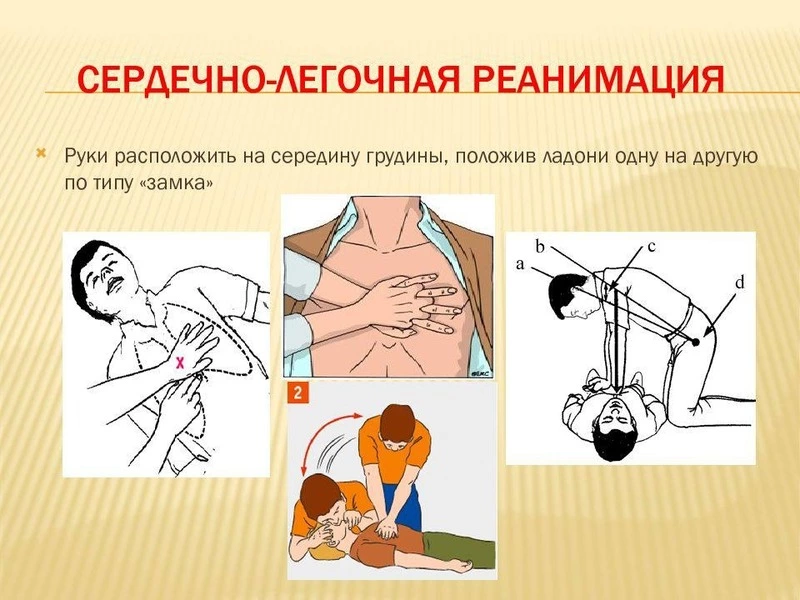 «При наличии дыхания необходимо приступить к проведению сердечно-лёгочной реанимации. Для этого производим давления руками на грудину пострадавшего, который должен располагаться лёжа на спине на твёрдой ровной поверхности. При этом основание ладони одной руки участника оказания первой помощи помещается на середину грудной клетки пострадавшего, вторая рука помещается сверху первой, кисти рук берутся в замок, руки выпрямляются в локтевых суставах, плечи участника оказания первой помощи располагаются над пострадавшим так, чтобы давление осуществлялось перпендикулярно плоскости грудины. Давление руками на грудину пострадавшего выполняется весом туловища участника оказания первой помощи на глубину пять–шесть сантиметров с частотой 100-120 раз в минуту. После 30 надавливаний руками на грудину пострадавшего необходимо осуществить искусственное дыхание методом „Рот-ко-рту“. Для этого следует открыть дыхательные пути пострадавшего (запрокинуть голову, поднять подбородок), зажать его нос двумя пальцами, сделать два вдоха искусственного дыхания. Далее следует продолжить реанимационные мероприятия, чередуя 30 надавливаний на грудину с двумя вдохами искусственного дыхания»,– рассказал Евгений Викторович.