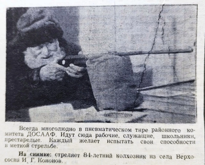 И в этом же году, в номере за 18 декабря, мы видим 84-летнего жителя села Верхососна И. Г. Кононова, зашедшего пострелять в тир районного комитета ДОСААФ. Количество репостов и лайков к этому посту говорит о том, что земляки узнали этого человека, и помнят о нём.