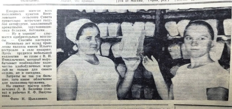 В номере за 16 сентября 1971 года, в фоторепортаже, рассказывалось о пекарне, построенной в селе Весёлое по решению правления колхоза им. Ильича. В ней работал небольшой коллектив во главе с В. И. Пищальченко, который выпекал душистый, ароматный хлеб, доставляемый на автофургоне. А со снимка, автором которого является Николай Цыкаленко, на нас с улыбкой смотрят Л. В. Беленко и К. Ф. Полупанова. Уверена, что многие жители села Весёлое и ныне помнят тот аромат, мягкого, горячего, с хрустящей корочкой и неимоверно вкусного хлеба.