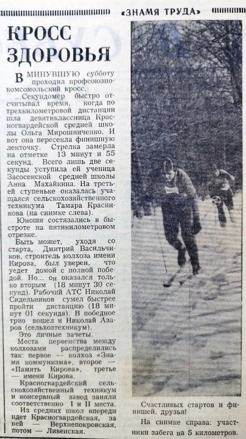 «В тот раз победителями стали на дистанции 3 км. Ольга Мирошниченко (Красногвардейская школа), две секунды уступила ей и заняла 2 место Анна Махайкина (Засосенская школа), Тамара Красникова 3 место (с/х. техникум)».