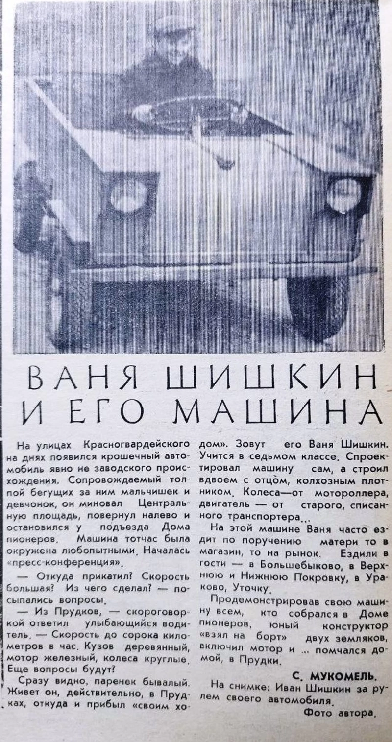 Интересная заметка попалась мне и в выпуске от 31 мая 1969 года. По моему мнению, она стала сенсацией местного масштаба. Мы, живущие сейчас, ознакомившись с фоторепортажем подготовленным сотрудником газеты Семён Мукомель, который носит название «Ваня Шишкин и его машина», были просто в недоумении... Многие задались вопросом: «А как такое возможно?». Всё дело в том, что в материале рассказывается о совместном техническом творчестве семиклассника из Прудков Вани Шишкина и его отца – плотника местного колхоза. Используя чертежи Ивана, колёса от мотороллера, а мотор от списанного транспортёра, они смастерили машину!