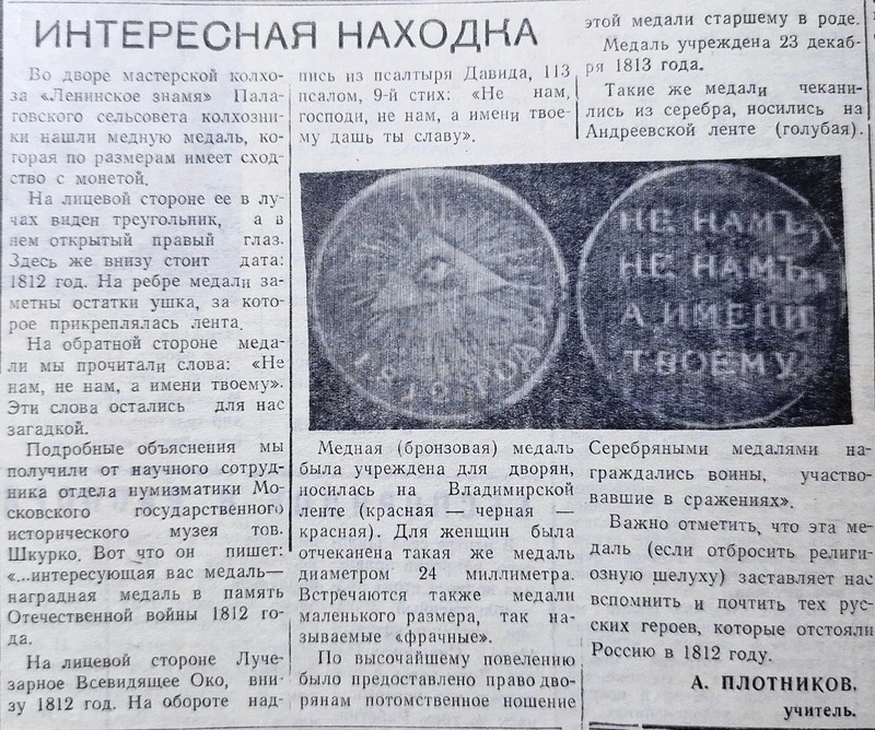 Была в 1969 году ещё одна не менее занимательная публикация под заголовком «Интересная находка» (от 8 июня). В ней шла речь о найденной во дворе мастерской колхоза «Ленинское знамя» Палатовского сельсовета наградной медали в память войны 1812 года. На лицевой стороне было изображено Лучезарное Всевидящее Око и надпись «1812 год». На оборотной стороне слова: «Не нам, не нам, а имени твоему», часть из псалтыря Давида, 113 псалома, 9 стиха. Медаль была утверждена 23 декабря 1913 года.