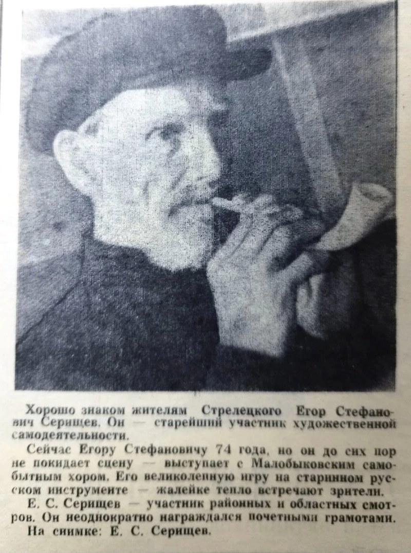 В руках ещё один номер районки, датированный 19-м октябрём 1972 года. Передо мной житель села Стрелецкое Егор Стефанович Серищев – старейший участник художественной самодеятельности.