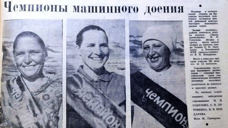 «Чемпионы машинного доения» – репортаж в номере за 19 июля 1975 года о трёх колхозницах-красавицах, которые стали победительницами шестого районного конкурса мастеров машинного доения. Это доярки Н. И. Соколова из колхоза «Знамя коммунизма», В. И. Литовкина из колхоза им. Ленина, В. И. Бондарева – совхоз-техникум, занявшие первое, второе и третье место соответственно. Думаю, что эту заметку будет интересно прочитать потомкам этих людей их детям, внукам, так как со дня публикации прошло уже почти 50 лет!