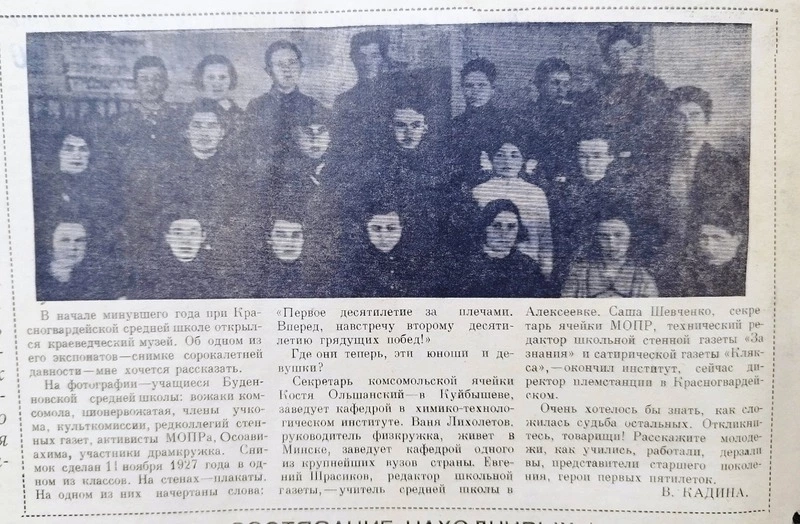 Материалы, опубликованные в нашей районной газете в прошлом XX веке очень интересны читателям и сегодня. Примером тому может служить серия размещённых публикаций в группе «Архивный отдел администрации района» которая базируется в соцсетях Одноклассники и ВКонтакте. Фотозарисовки, сюжеты, опубликованные в нашей газете, преимущественно в советское время, получили живой интерес со стороны пользователей всемирной паутины. К примеру, рассказ в номере от 7 января 1969 года. В нём идёт речь о снимке, который был датирован 11-м ноябрём 1927 года. На нём изображены учащиеся Будённовской средней школы: вожаки комсомола, пионервожатая, члены учкома, редколлегии, стенных газет и активисты МОПРа. Всего на фотографии 21 человек. А знакомит читателя со снимком, как с экспонатом открывшегося в 1968 году школьного музея автор публикации В. Кадина. В своей заметке она рассказывает о судьбе некоторых школьников и задаётся вопросом: «Как сложилась судьба у каждого из присутствующих на фотографии?».