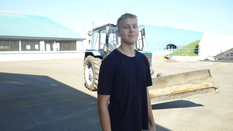 К пяти часам утра Василий Анатольевич доставляет Дениса на ферму, который сразу же приступает к раздаче корма животным. Затем обеспечивает концентратами молодняк. Вскоре потребовалось механической лопатой переместить ближе к кормушкам сенажную массу, с которой начинался рабочий день.
