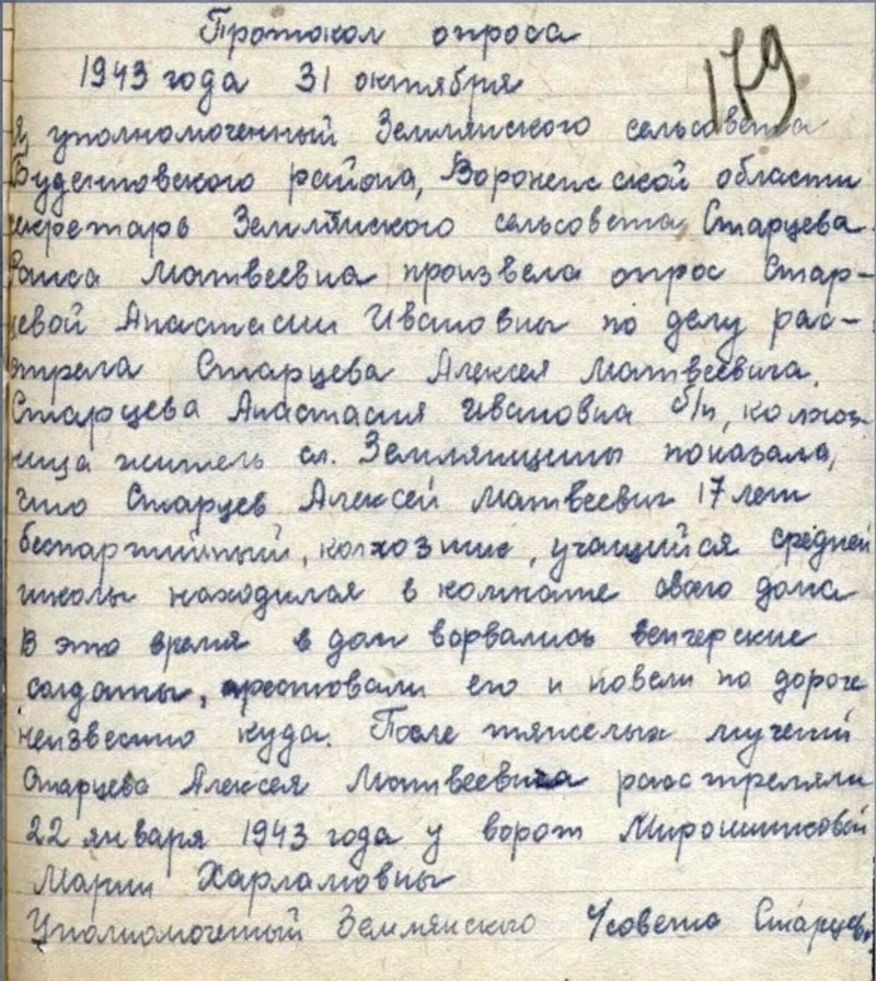 Ещё одним свидетельством зверств оккупантов является протокол опроса жительницы слободы Землянщина Будённовского района Анастасии Ивановны Старцевой от 31 октября 1943 года. Проводившая его уполномоченная Землянского сельсовета Буденновского района, секретарь Землянского сельсовета Раиса Матвеевна Старцева отмечает, что Алексей Матвеевич Старцев, 17 лет, беспартийный, колхозник, учащийся средней школы находился в комнате своего дома, когда в него ворвались военнослужащие неприятельской армии. Они арестовали молодого человека и повели по дороге в неизвестном направлении. После тяжёлых истязаний его расстреляли 22 января 1943 года у ворот Марии Харламовны Мирошниковой Марии. (ГАБО. Фонд Р-199. Оп. 4. Д. 11 Л. 179).