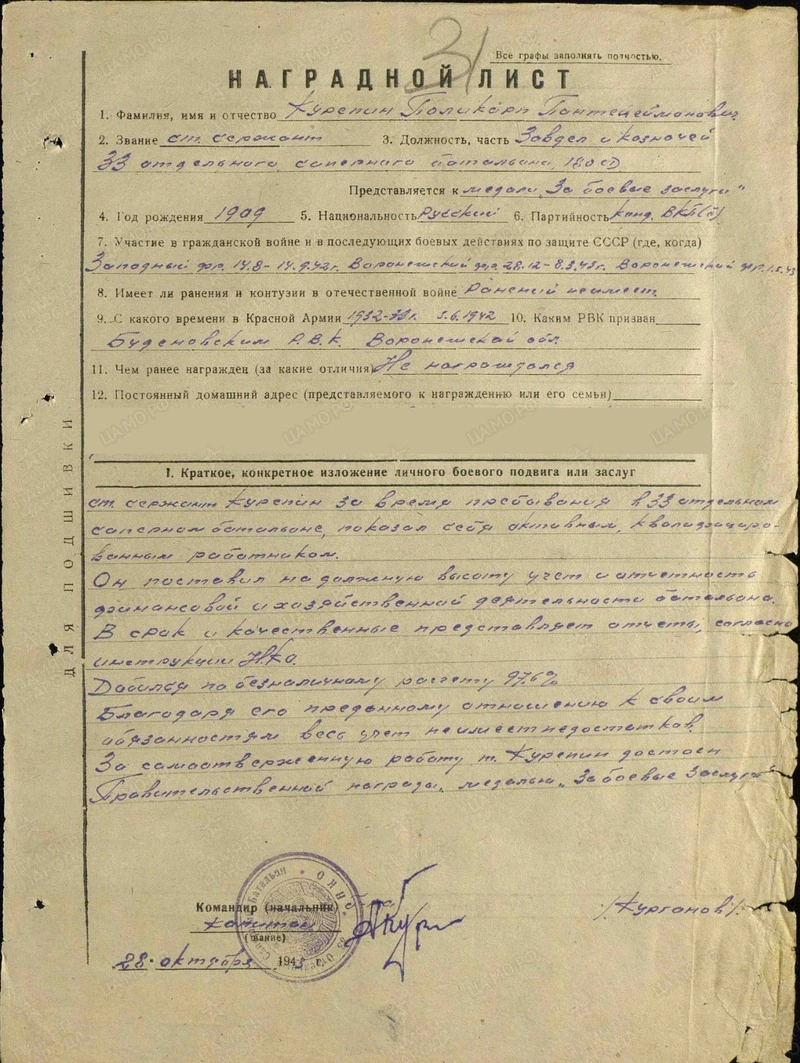 «Старший сержант Курепин за время пребывания в 33-м отдельном сапёрном батальоне показал себя активным квалифицированным работником. Он поставил на должную высоту учёт и отчётность финансовой и хозяйственной деятельности батальона. В срок и качественно предоставляет отчёты, согласно инструкции. Добился по безналичному расчёту 97,6 %. Благодаря его преданному отношению к своим обязанностям весь учёт не имеет недостатков. За самоотверженную работу ст. сержант Курепин достоин Правительственной награды – медали „За боевые заслуги“. 28 октября 1943 года», – говорится в наградном листе моего прадедушки.