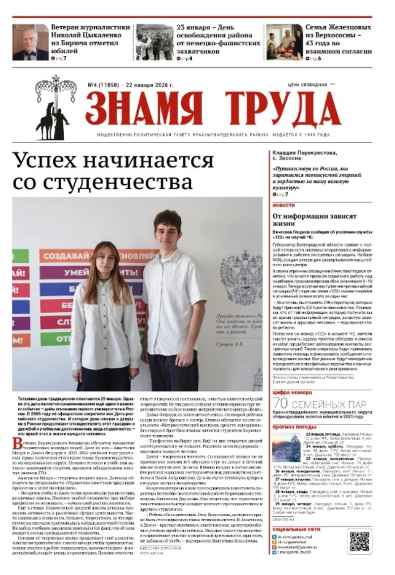 Газета «Знамя труда» № 4 от 22 января 2026 года