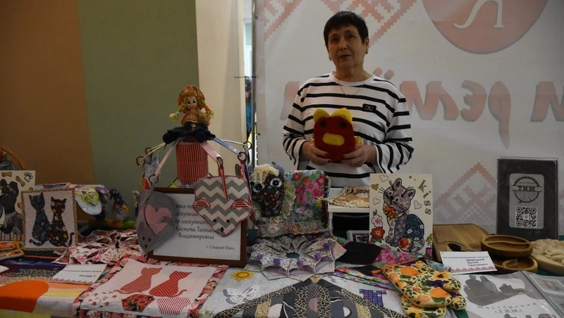 Из Старого Оскола приехала мастер лоскутного шитья Татьяна Костева. Мягкие салфетки, панно, декоративные рукавички – всё выполнено аккуратно, со вкусом, с любовью к фактуре и цвету.