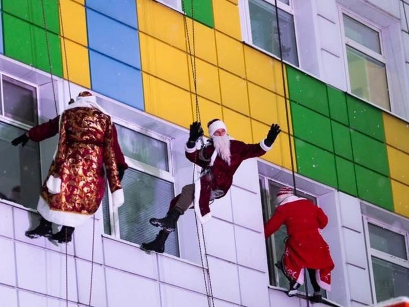 По доброй традиции, маленьких пациентов поздравил десант Дедов Морозов. Они спустились с крыши здания.