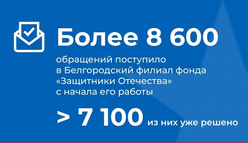 Более 8,6 тысяч запросов об оказании помощи поступило в Белгородский филиал фонда «Защитники Отечества», 7100 из которых уже решены. Всего по стране – в 89 филиалов фонда – с начала его работы поступило свыше 2 млн. обращений. Из них более 1, 9 млн. – почти 92%, решено.
