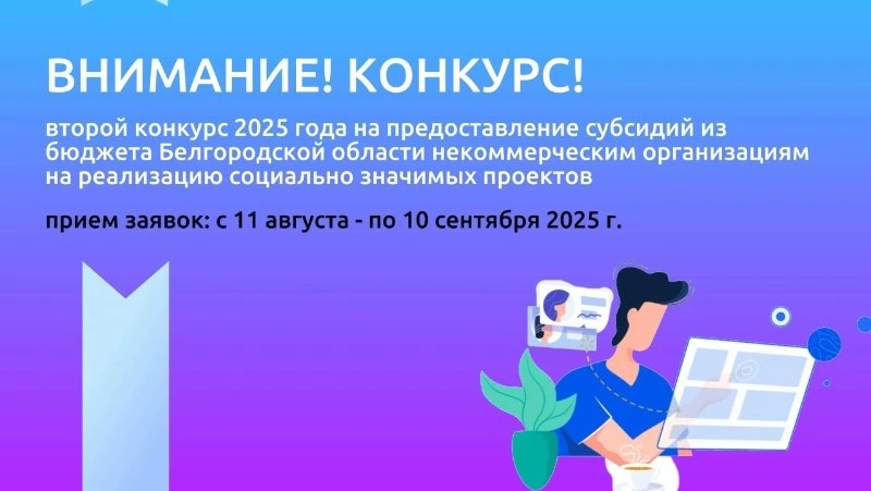 Министерство общественных коммуникаций Белгородской области проводит второй конкурс 2025 года на предоставление субсидий из бюджета Белгородской области некоммерческим организациям на реализацию социально значимых проектов. Прием заявок для участия в конкурсе начинается 11 августа и заканчивается в 00:00 часов 10 сентября на портале проведения конкурса. Шифр отбора 25-825-2102Ф-1-0214.