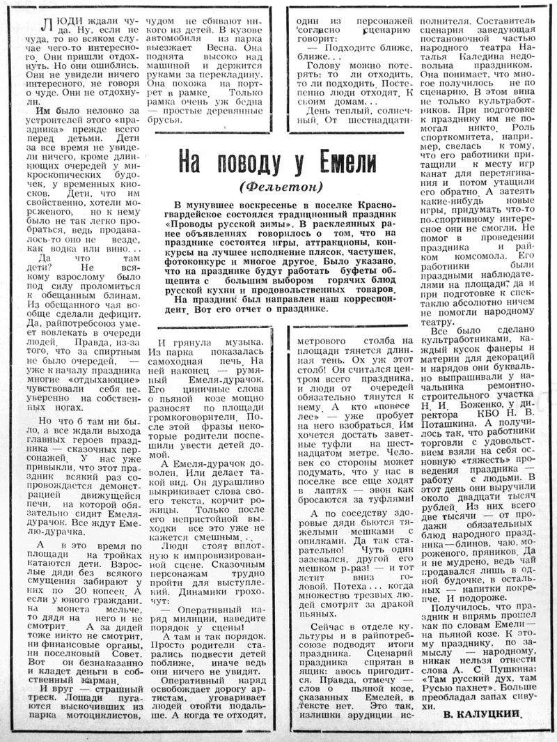 Шишки ловил и я. В феврале 1976 года опубликован мой фельетон «На поводу у Емели». Это был непредвзятый рассказ о том, как в райцентре отметили масленицу. Отправляя меня на задание, Праведников сказал: