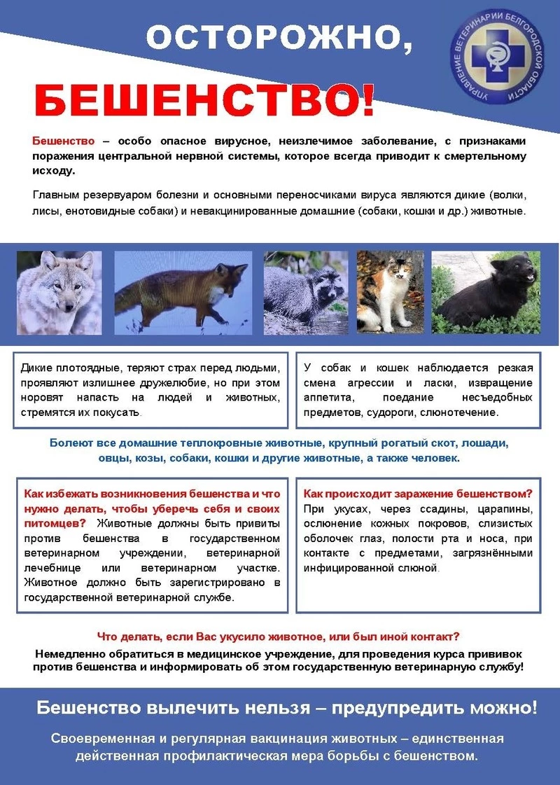 Бешенство – одно из самых особо опасных абсолютно смертельных заболеваний животных и человека с признаками поражения центральной нервной системы. Основные переносчики вируса - дикие и домашние животные. Заражение им происходит через слюну при укусах, через ссадины, царапины, ослюнение кожных покровов, слизистую оболочку глаз, полости рта и носа, при контакте с предметами, загрязнёнными инфицированной слюной. Дикие плотоядные теряют страх перед людьми, проявляют излишнее дружелюбие, но при этом пытаются напасть. У собак и кошек наблюдается смена агрессии и ласки, извращение аппетита, судороги, обильное слюнотечение.