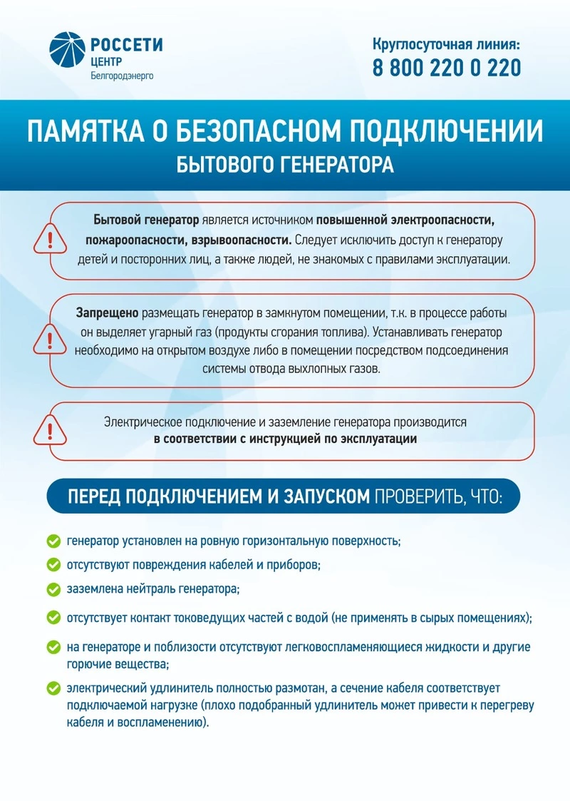 Филиал «Россети Центр» – «Белгородэнерго» напоминает потребителям, устанавливающим индивидуальные дизельные и бензиновые генераторы, что подключать их нужно четко в соответствии с инструкцией и обязательно после электросчетчика. Это необходимо для того, чтобы исключить электроэнергию, выработанную генератором, из расчетных платежей.