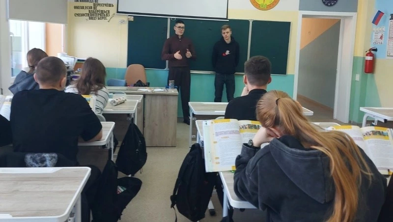 Егор Хмара – выпускник 2025 года – ныне, курсант Ульяновского института гражданской авиации имени Главного маршала авиации Б. П. Бугаева. Ученикам 8 и 9 «Б» классов. Егор рассказал о своём учебном заведении – одном из крупнейших вузов страны по подготовке кадров для авиационной отрасли. В нём более десяти профилей и специализаций для работы в гражданской авиации. Егор показал ребятам презентации, раздал познавательные буклеты.